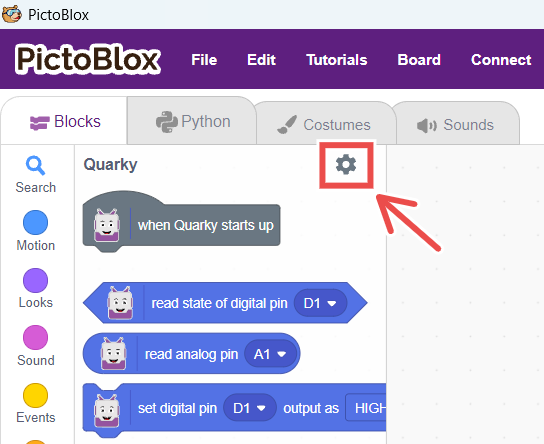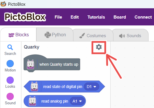 To access Quarky Settings in PictoBlox, refer to the screenshot below.