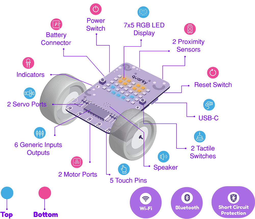 Quarky is a powerful, portable device that allows users to create complex projects with its 3.7V Li–ion battery support, two tactile switches, five capacitive touch sensors, two infrared sensors, and general–purpose input–output pins. It includes 35 programmable RGB LEDs in a 7×5 grid for creating animations, writing text, and displaying patterns, as well as a good-quality speaker for human-like audio or buzzing. Additionally, it has Wi–Fi and Bluetooth compatibility, and multipurpose input/output pins that can be used to interface with any third–party sensors. Quarky also has protections for reverse polarity, overvoltage, and overcurrent.
