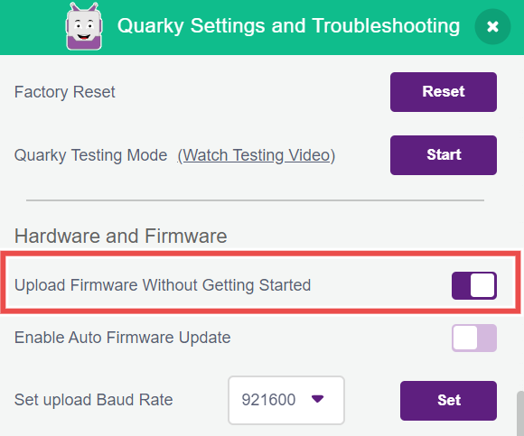 This program also runs when you update the firmware, but you can choose to skip it by enabling “Upload firmware without Getting Started” in Quarky Settings.