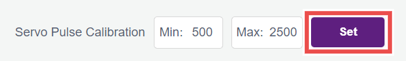 4.4.2 These pulse width values are given just as an example, and it may vary according to the servo used. So to calibrate your servo’s minimum and maximum position, you can set their values in the Min. and Max. Field and click on Set button. You can check the calibration result by running the set servo to [x] angle from the robot palette.