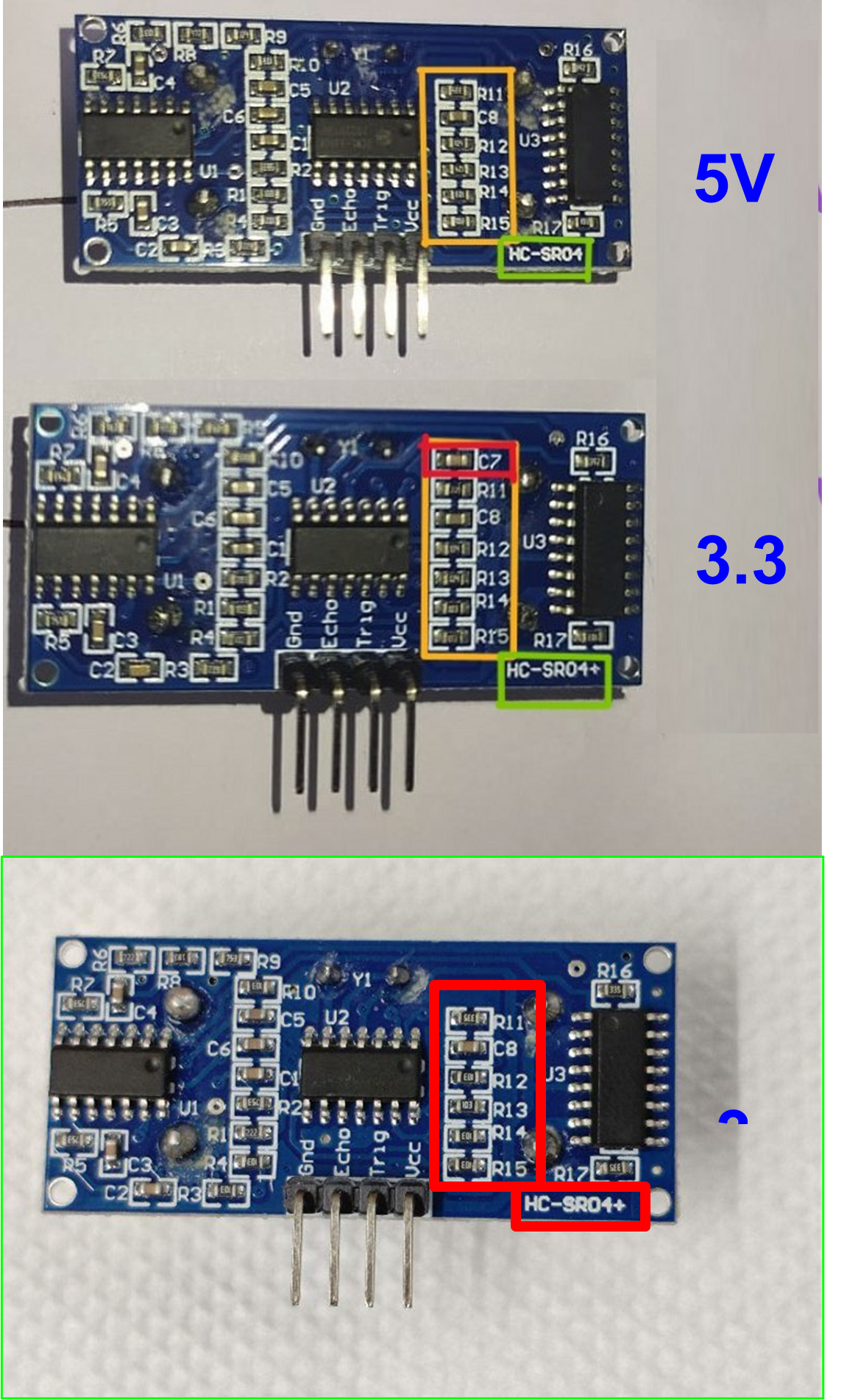 4.12.4 Check for the part number on the sensor (depicted by the Green box in the image below). Search for the text HC-SR04+, which means it is 3.3V compliant. If the part number is HC-SR04, then it is a 5V version and won’t work with Quarky.