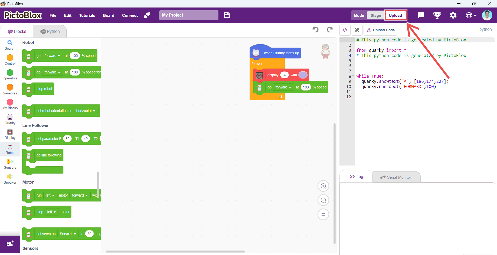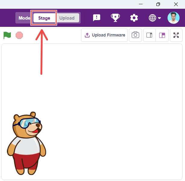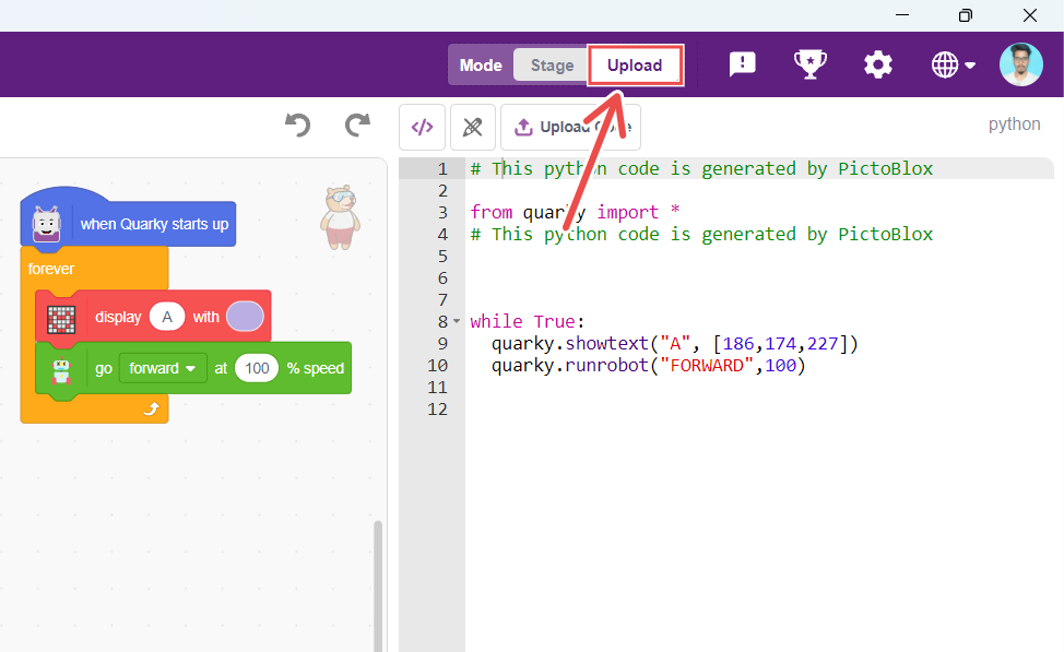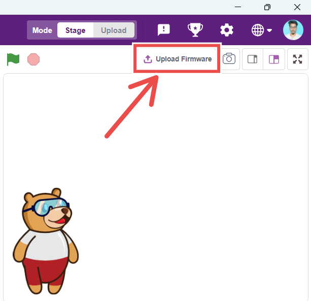Firmware is required to run Quarky in Stage Mode. To upload the firmware, simply click the “Upload Firmware” button above the Stage in PictoBlox.