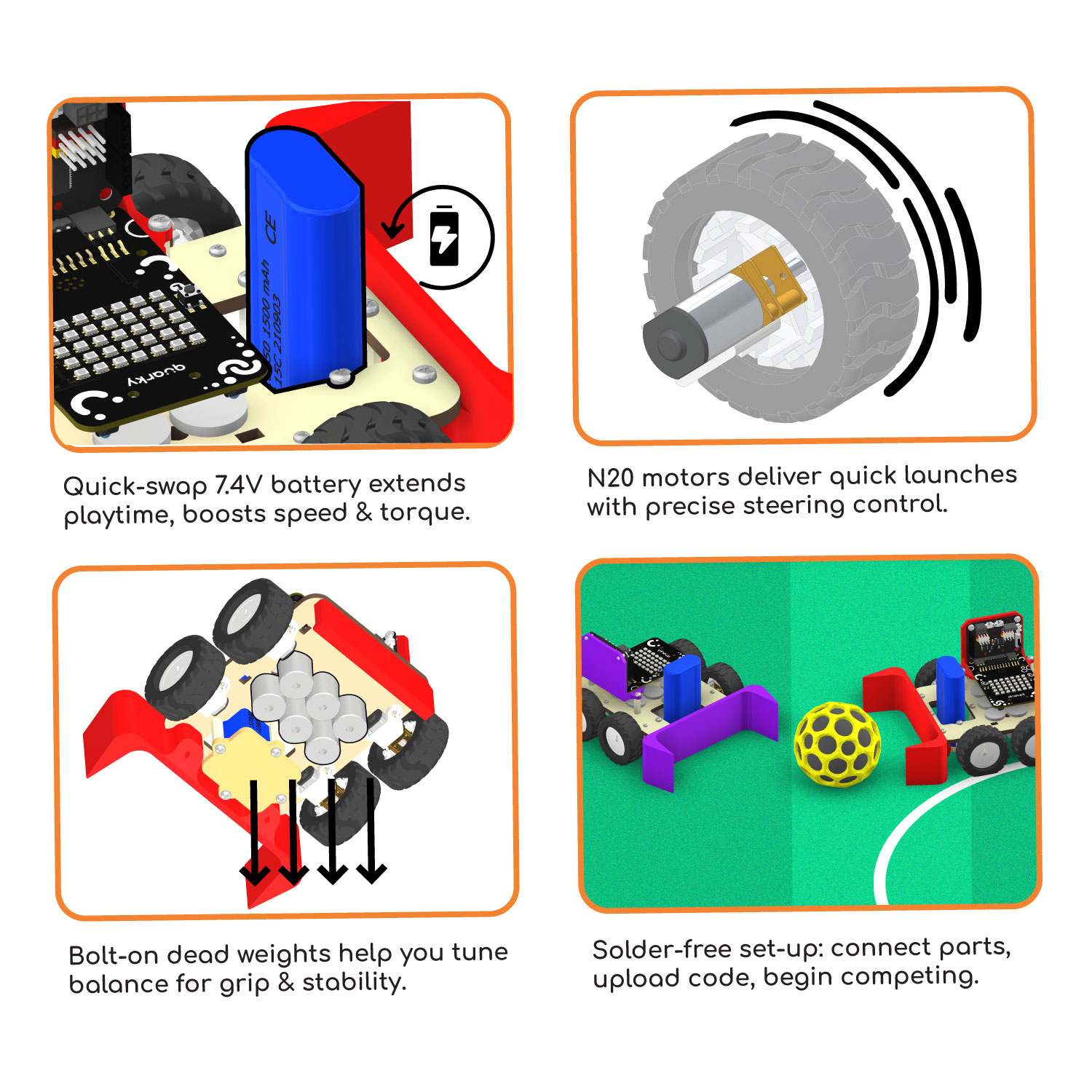 All-in-One Setup: Equipped with 4 high-speed motors with wheels, durable chassis and claw, dual batteries (7.4 V and 3.7 V), Quarky Board + Expansion Board, charger, USB cable, and dead weights — all components are carefully curated for high performance and easy assembly.